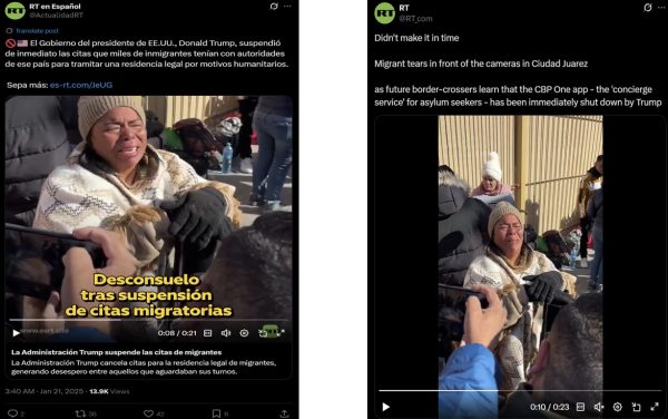 This contradictory messaging was most apparent when an outlet covered identical issues or incidents in both languages. For example, after Trump shut down the CBP One application, which resulted in the cancellation of thousands of asylum appointments for refugees waiting on the US-Mexico border, RT’s English- and Spanish-language accounts posted identical videos of a refugee crying but with text that provided different framings. RT en Español shared the video to emphasize “despair” over the decision. RT’s English-language service posted the same video, called the refugees “future border-crossers”, and seemingly mocked them for crying “in front of the cameras” and not making it “in time”.