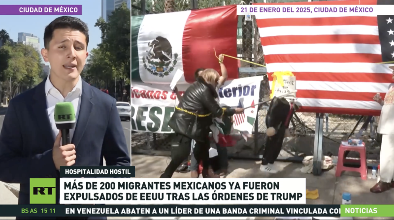 Figure 5: RT en Español reported that Trump’s first 100 days were marked by “deportation, raids, and panic”, and showed a video highlighting violent methods employed by an ICE officer.