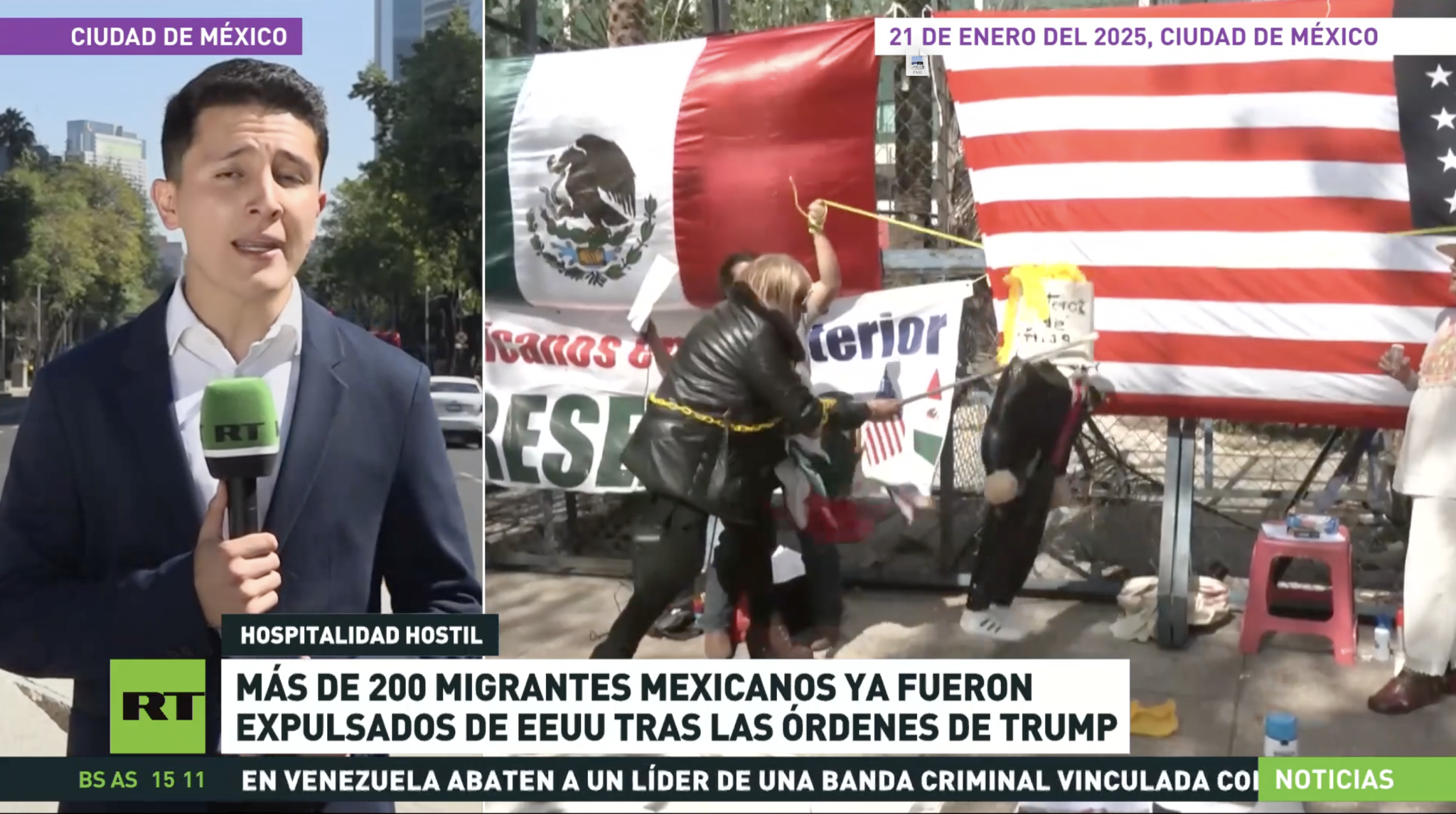 Figure 3: A Sepa Más segment, headlined “Hostile Hospitality”, negatively frames US border policies and includes a clip of protesters beating a Trump piñata.