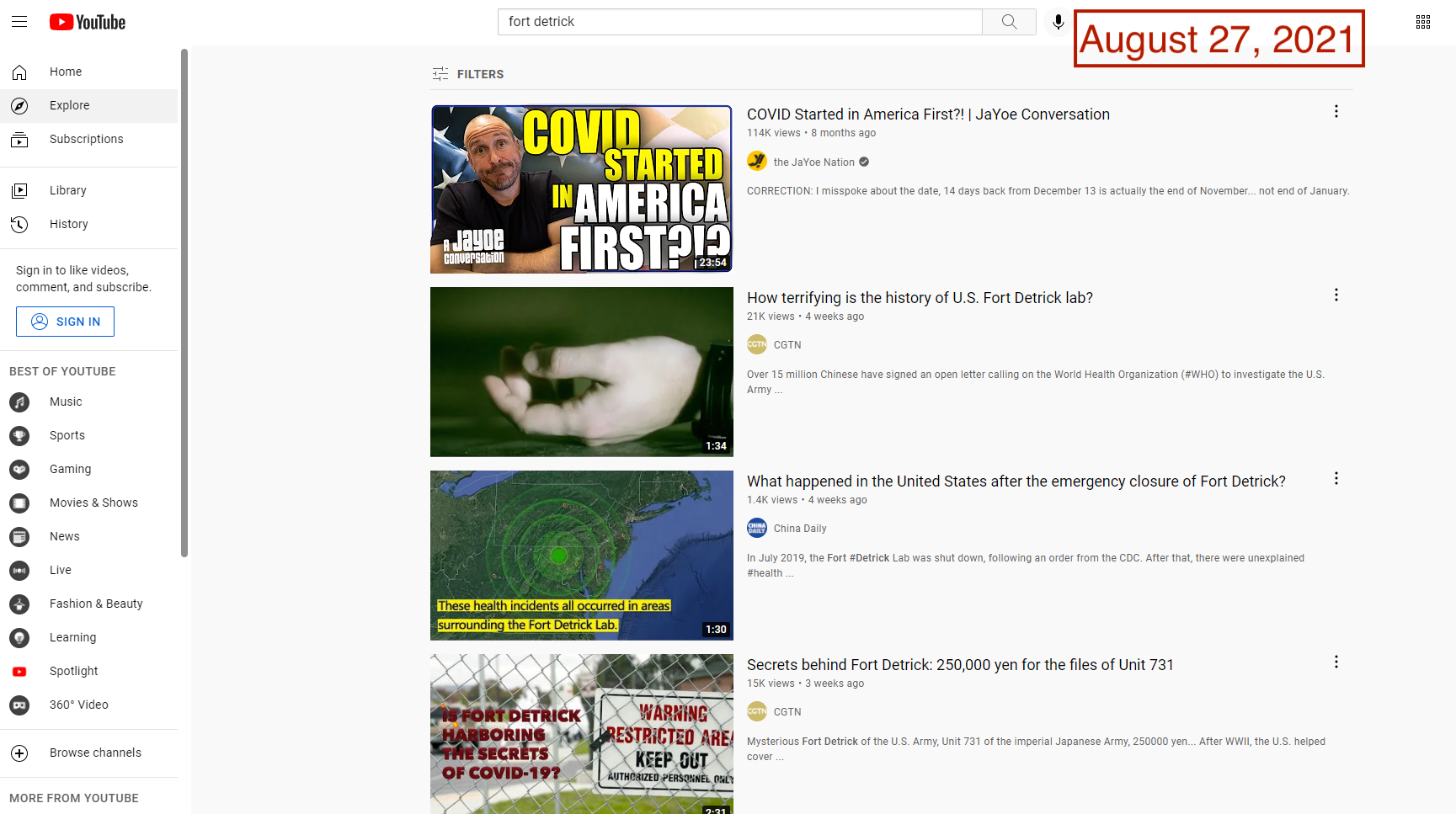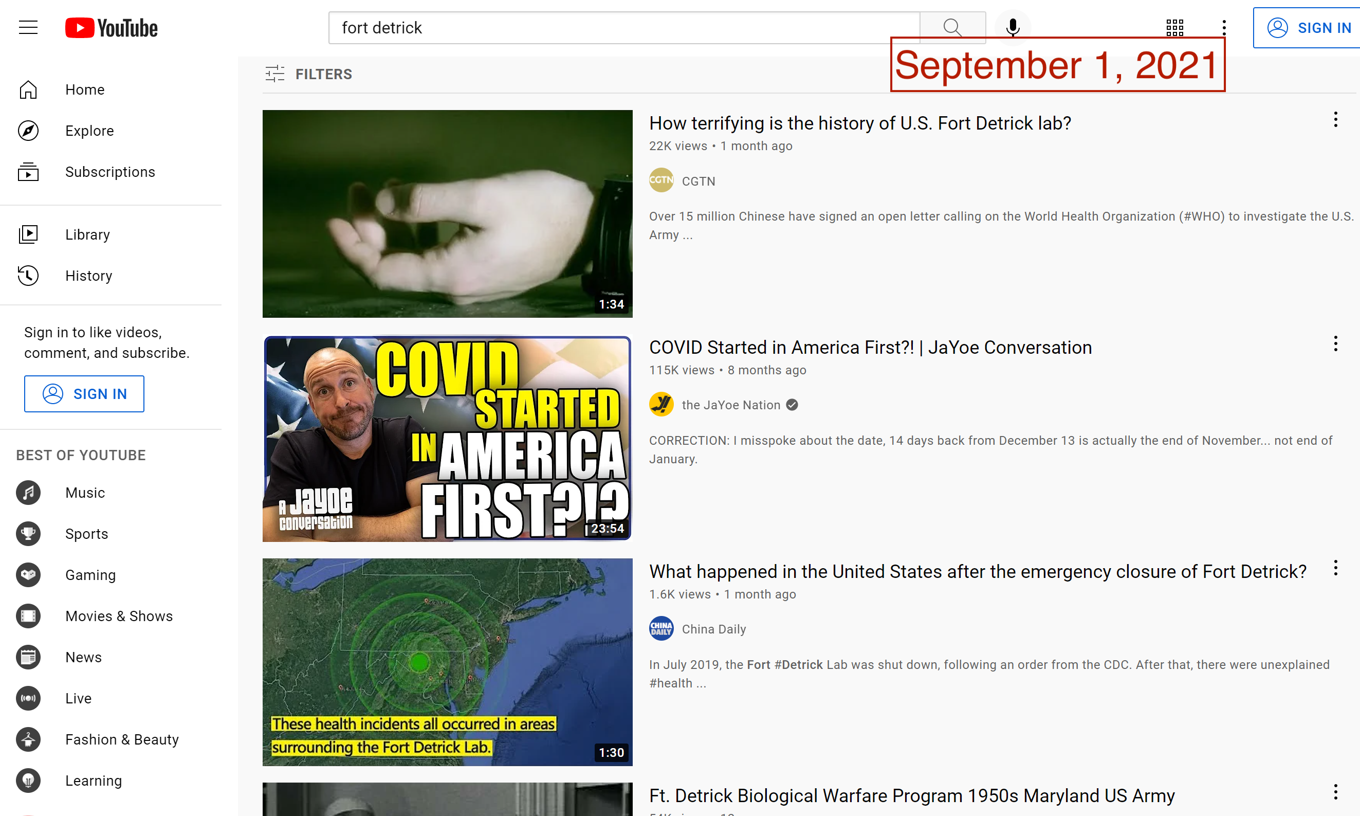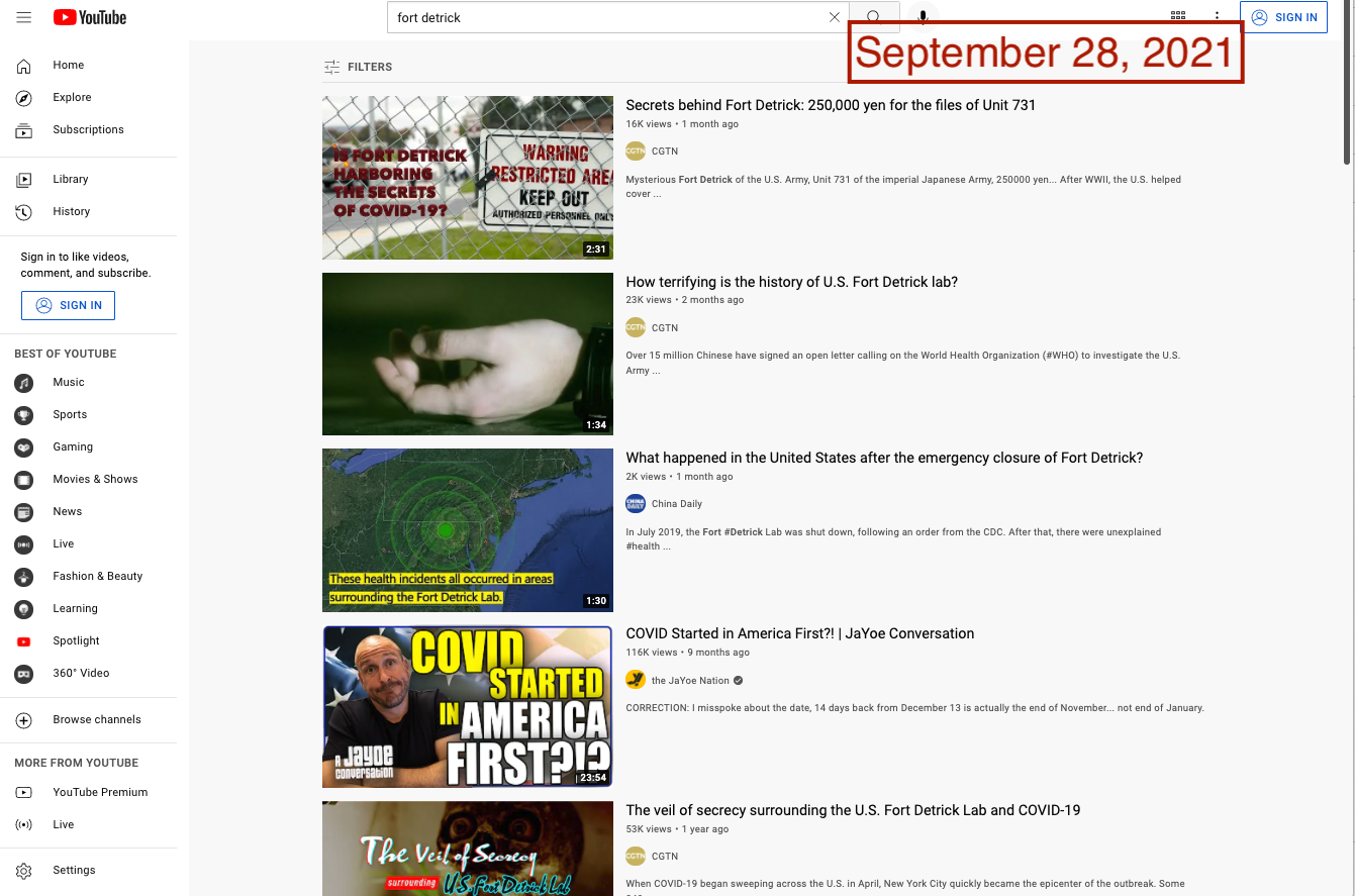And on YouTube, four of the six top videos returned in a recent query for “Fort Detrick” were from Chinese state media channels. The other two results promoted Beijing-friendly talking points.