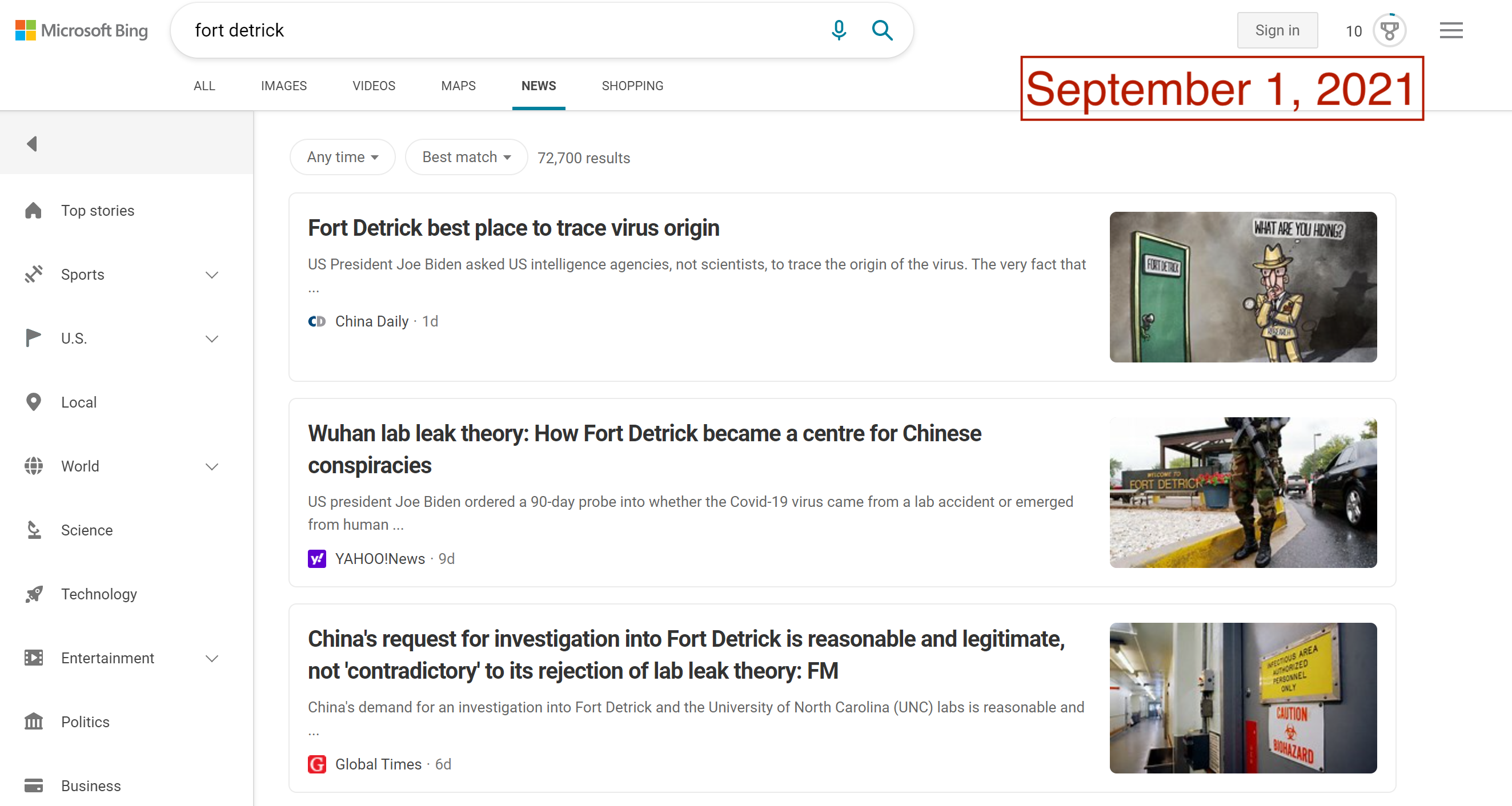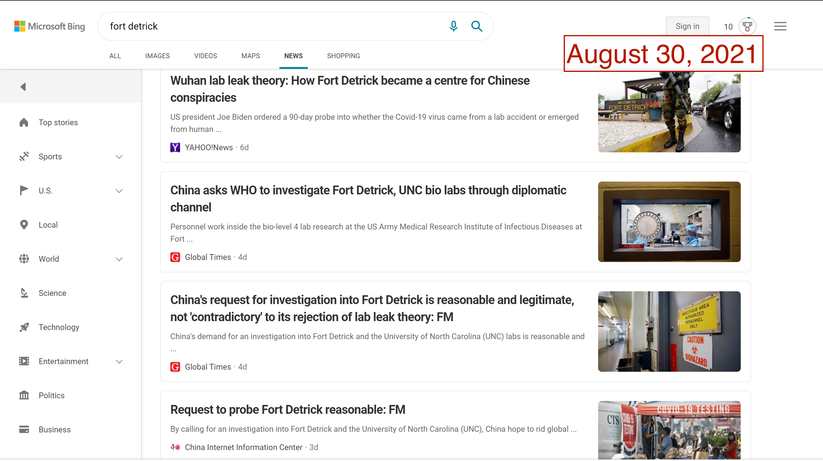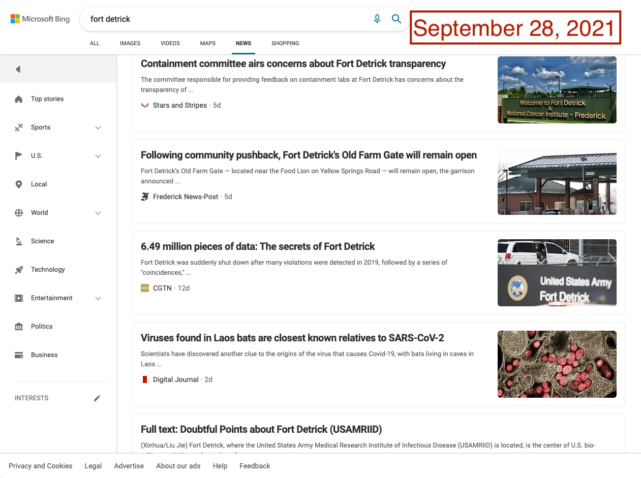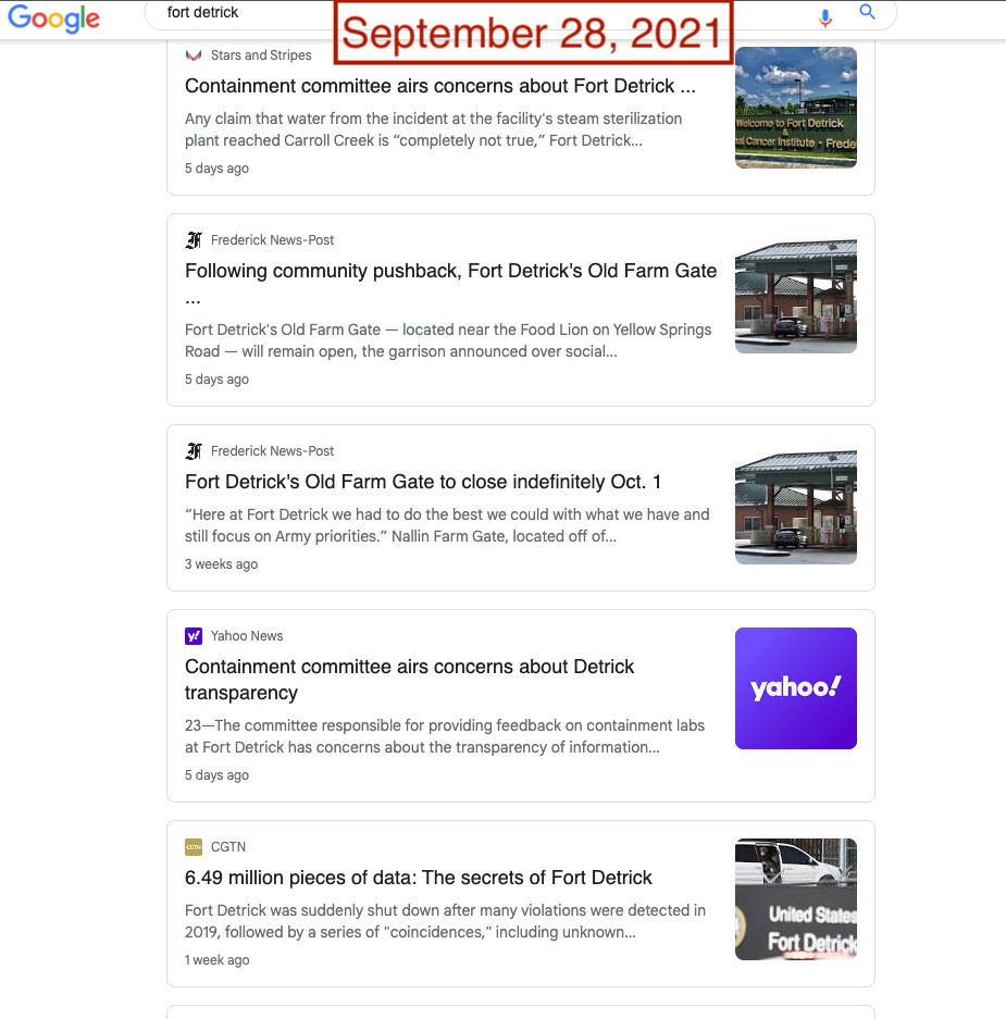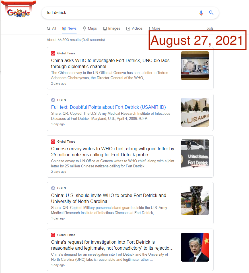 For people encountering the world of Fort Detrick conspiracies for the first time, turning to a search engine would be a common step in the search for information. Unfortunately, popular search engines could lead consumers directly to the very sources of Fort Detrick conspiracy theories. In August and September, Google News results for “Fort Detrick” were dominated by CGTN and the Global Times, two Chinese state-run outlets that are central to Beijing’s information operations. In late August, the frequency and volume of misleading stories about Fort Detrick reached enough of a peak to also dominate Google’s Top Stories feature. Searches on Bing News have not fared much better, with Global Times and China Daily appearing in top results.