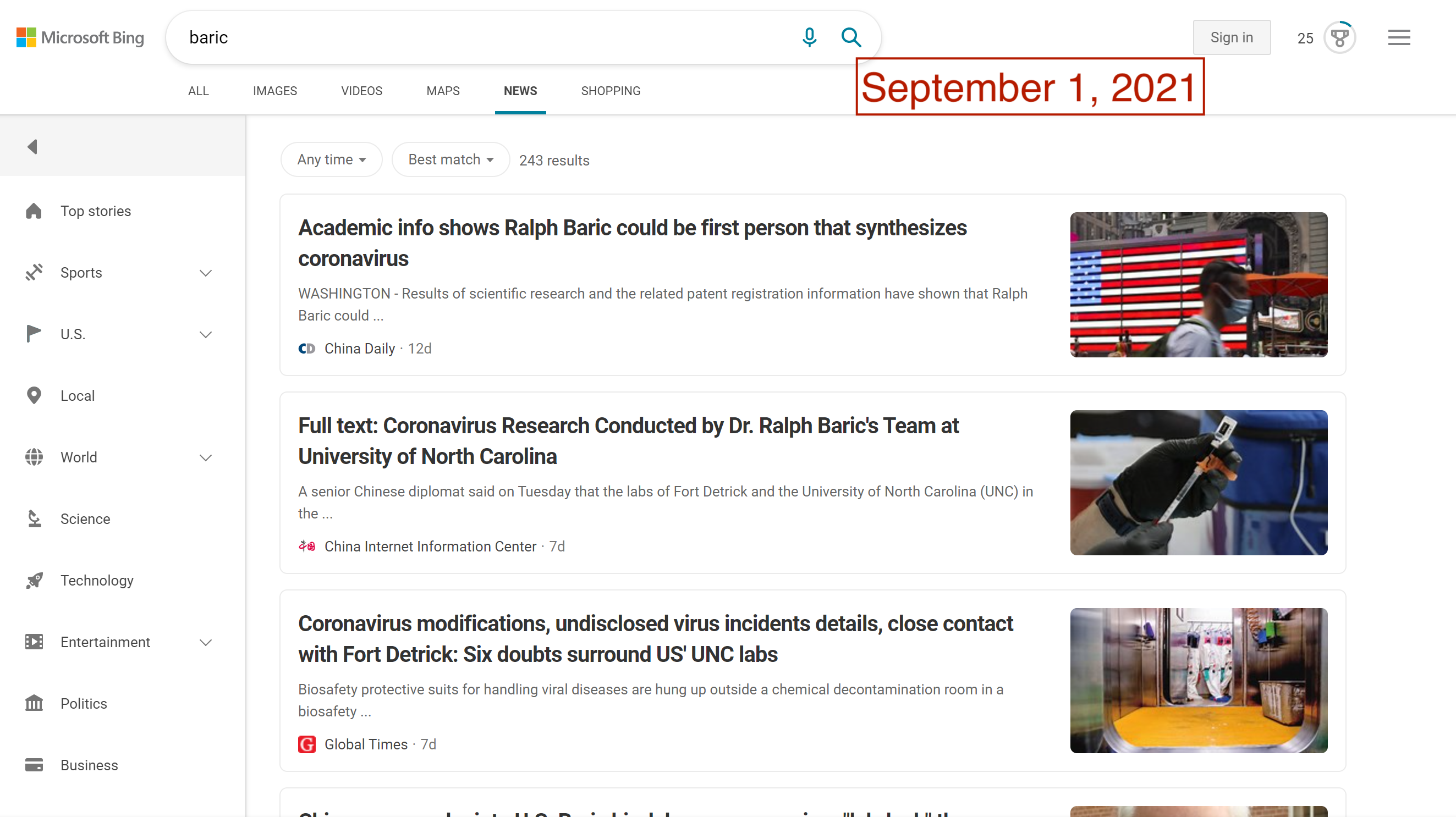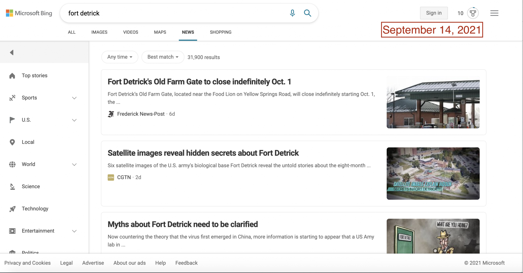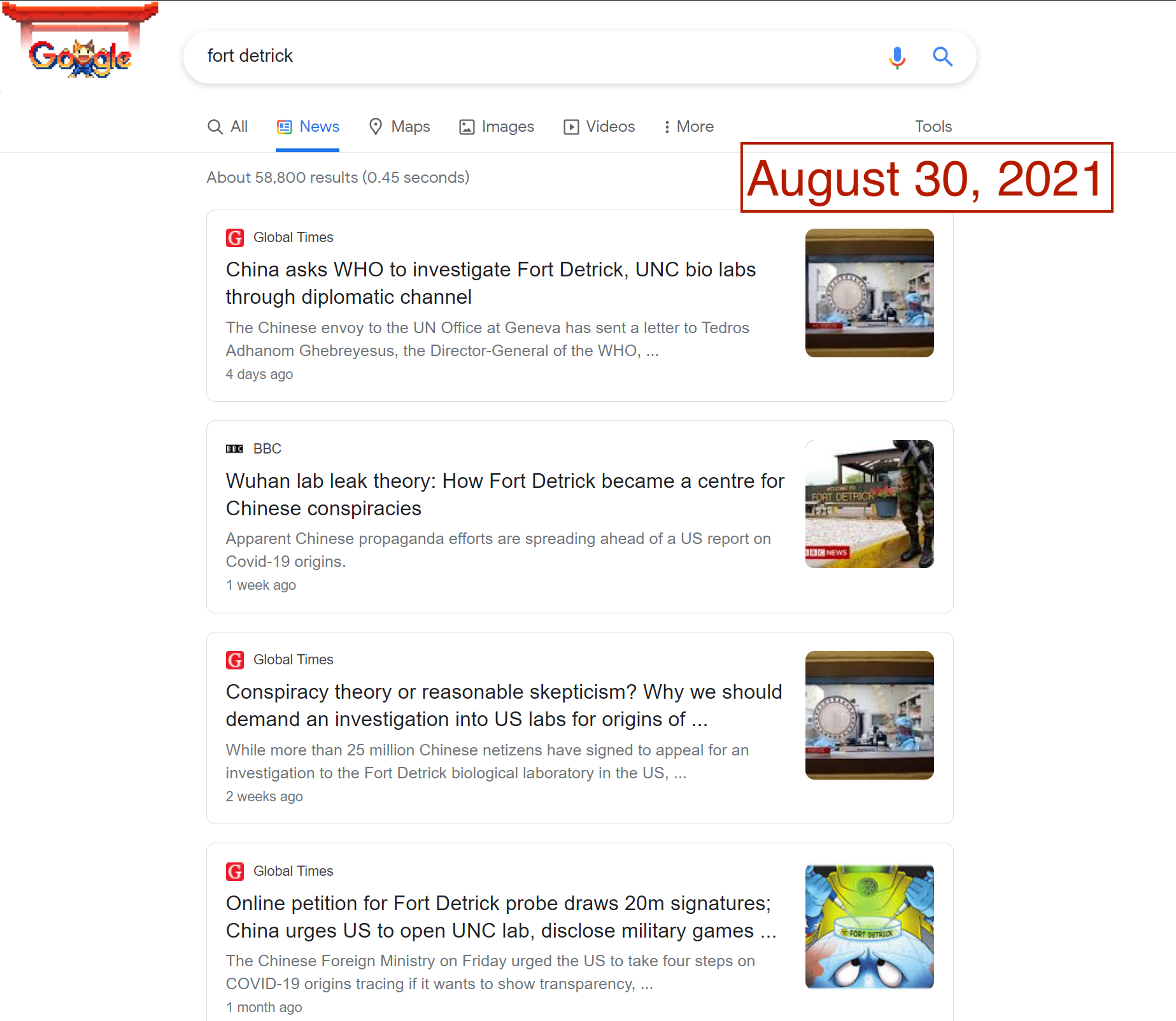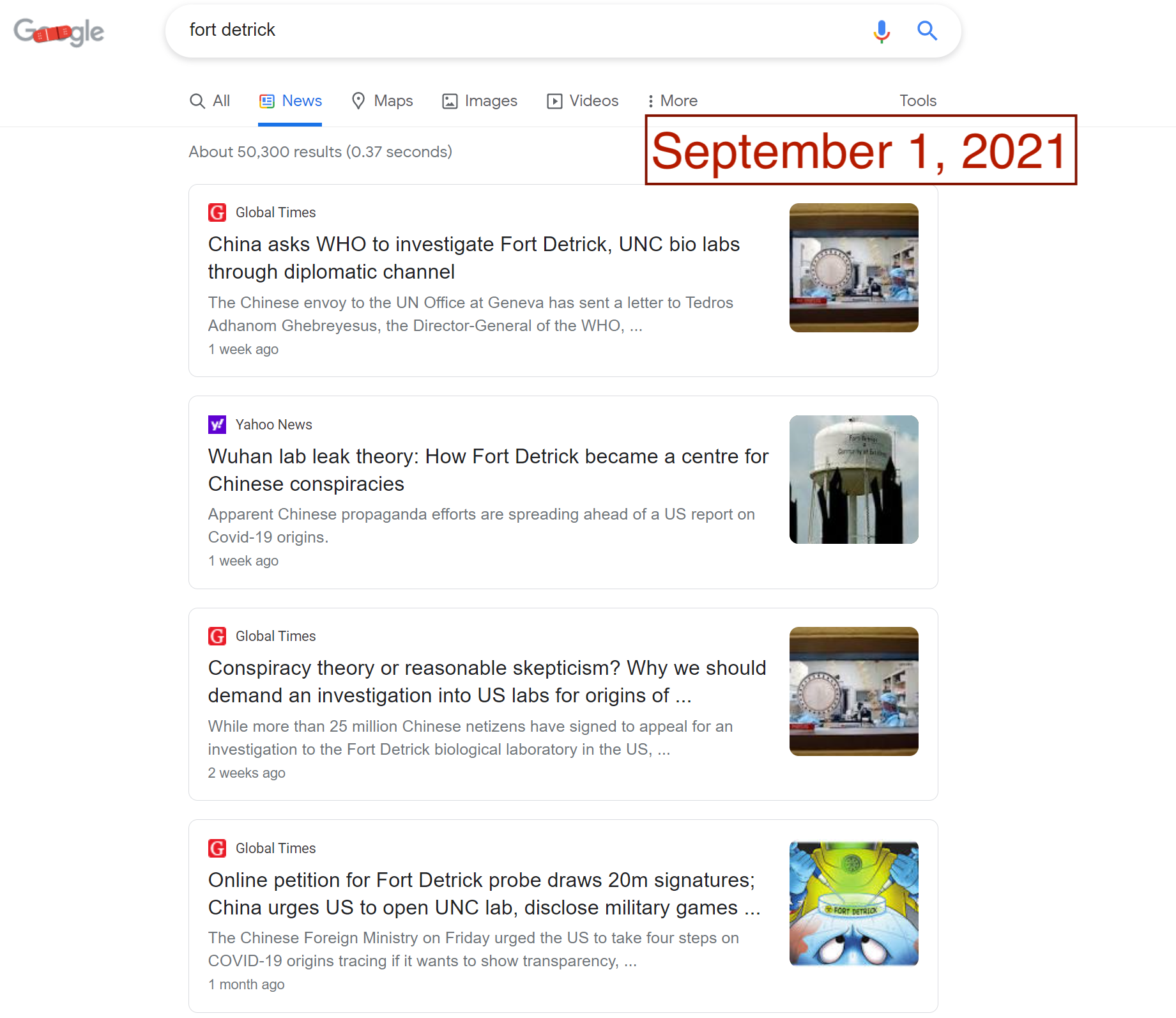 For people encountering the world of Fort Detrick conspiracies for the first time, turning to a search engine would be a common step in the search for information. Unfortunately, popular search engines could lead consumers directly to the very sources of Fort Detrick conspiracy theories. In August and September, Google News results for “Fort Detrick” were dominated by CGTN and the Global Times, two Chinese state-run outlets that are central to Beijing’s information operations. In late August, the frequency and volume of misleading stories about Fort Detrick reached enough of a peak to also dominate Google’s Top Stories feature. Searches on Bing News have not fared much better, with Global Times and China Daily appearing in top results.