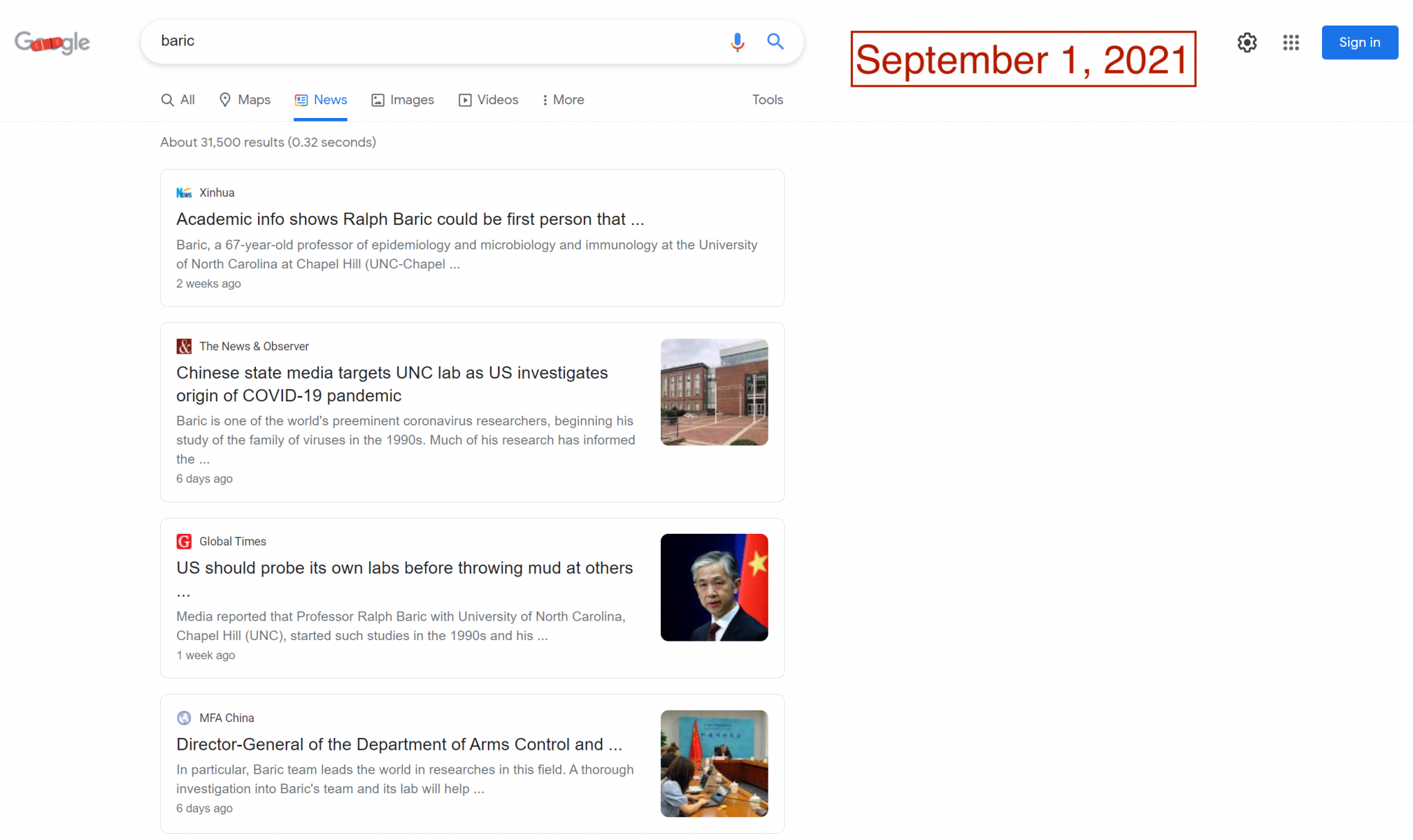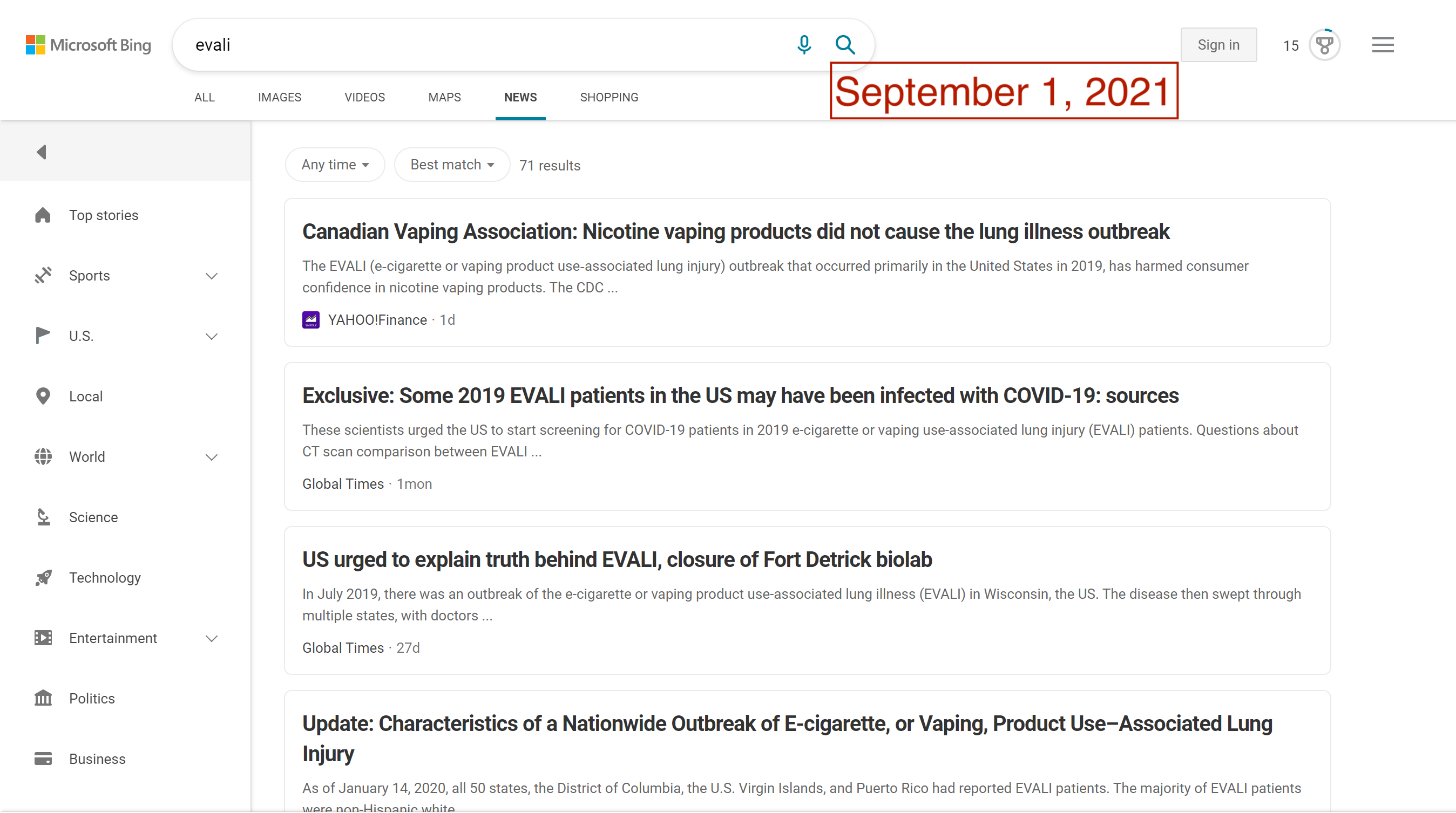 Third, the narratives surrounding Fort Detrick show that manipulation of data voids can be multidimensional, hinging not just on single search terms but a cluster of related ones. For example, one narrative strand has tried to implicate University of North Carolina professor and epidemiologist Ralph Baric in the creation of the coronavirus. Another has suggested a link between Fort Detrick and an outbreak of EVALI (e-cigarette or vaping use-associated lung injury) that occurred in 2019 in Wisconsin. Searching for news about “Baric” or “EVALI” on Google and Bing leads to results dominated by the Global Times, China Daily, and Xinhua, all related to Fort Detrick and the origins of COVID-19. These individual terms form a network of data voids, each reinforcing the problematic ideas of the other.